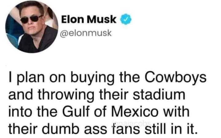 Uncategorized I may not like Musk personally, but I share his same feelings about the Cowboys and their fans. Lol Standard